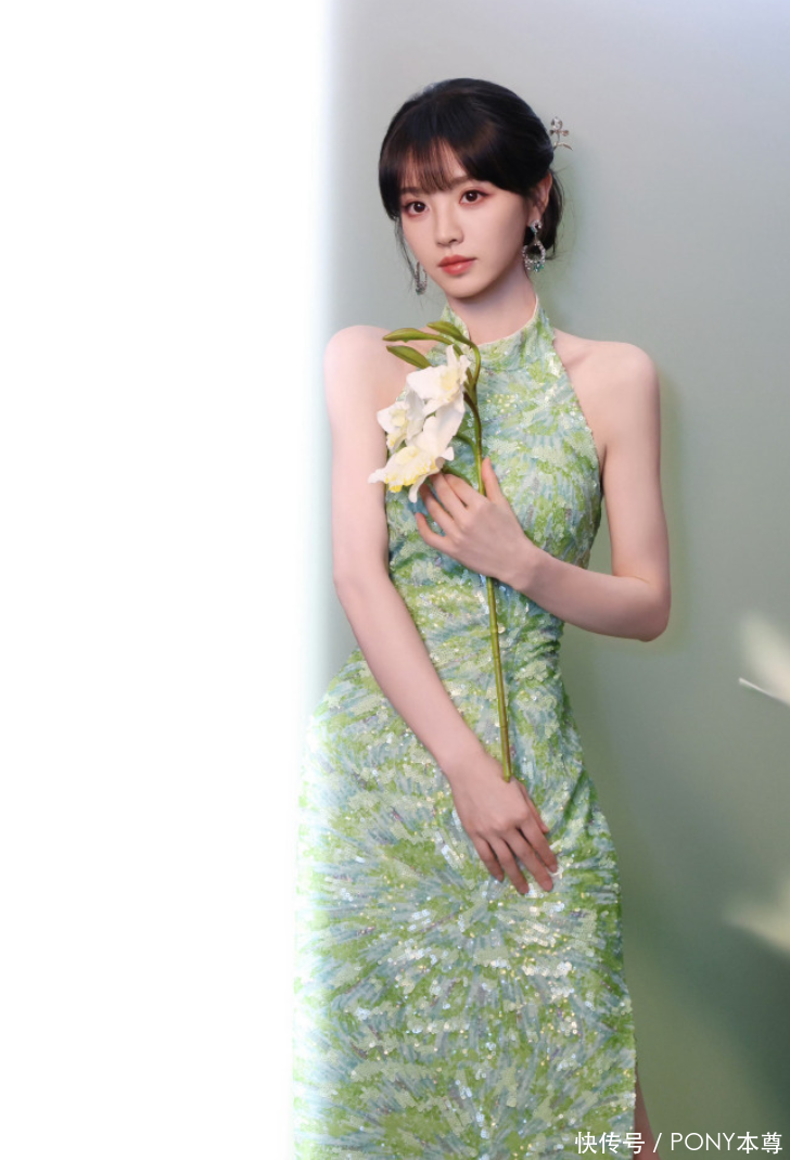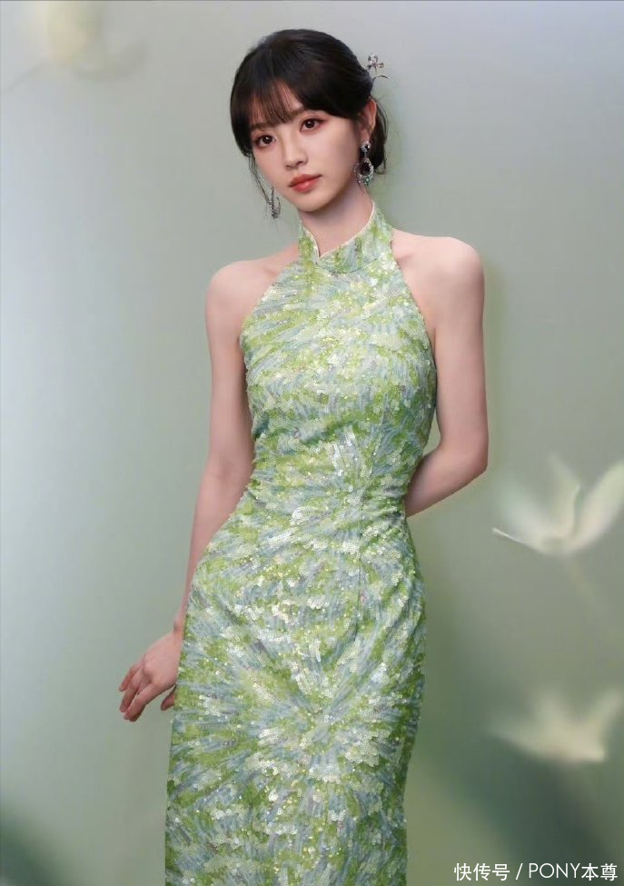 另一款绿色挂脖设计的新中式旗袍裙,同样美得让人移不开眼。这款旗袍延续了绿色系的东方韵味,却在细节上做出差异化:亮片刺绣元素更为密集,纹样设计更显精致,每一片亮片都与刺绣图案完美融合,既有亮片的闪耀质感,又有刺绣的细腻层次,让绿色裙身在不同光线下呈现出丰富的视觉效果;挂脖设计依旧聚焦肩颈线条,却在领口弧度上更显柔和,更贴合田曦薇娃娃脸的娇俏气质,让雅致中多了几分少女感。